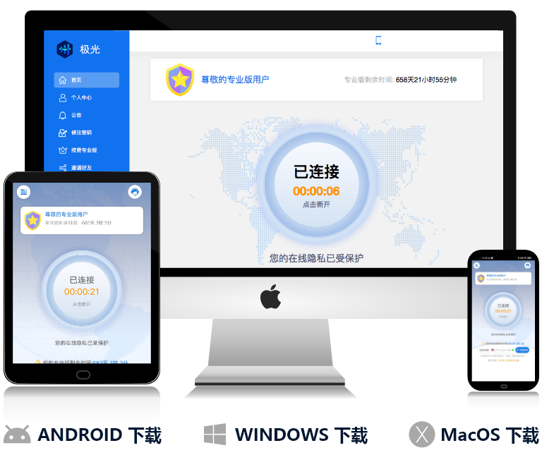极光现已全面支持Windows,Mac,Android等客户端,其他平 台产品也在加紧开发中。连接使用只需要一个开关即可。访问无限 制的网络,只是片刻之间.